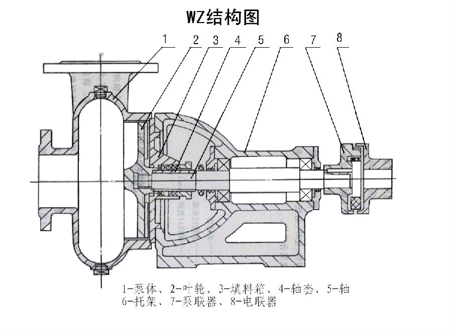 WZ型無堵塞泵是一種物料損害小、無纏繞、無堵塞的新型雜質(zhì)污水泵。該泵設(shè)計(jì)獨(dú)特,葉輪不位于泵腔中心,而退縮至離開蝸室配置。輸送介質(zhì)不通過葉輪,直接從泵腔中獲得能量,靠葉輪旋轉(zhuǎn)時(shí)產(chǎn)生的旋轉(zhuǎn)渦流傳遞能量,暢通無堵地從泵出口輸出。